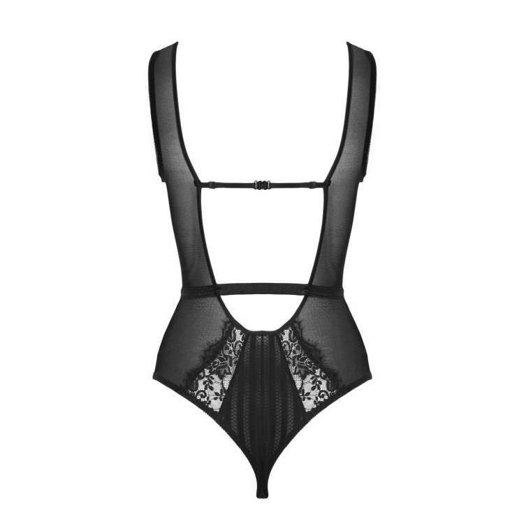 Black bodysuit with eyelash lace cups and straps.