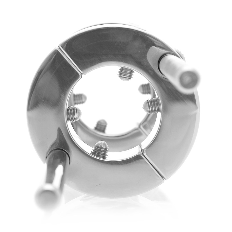 Maintain a pleasant tug on your balls or experience a tortuous extreme stretch with the fully adjustable Hells Bridge Ball Stretcher. With the two stainless steel rings side by side, place your balls through the openings and lock the rings closed with the included hex key. Now that both rings are secure around your sack, you can begin to rotate the nut on the side of the outer ring, causing the rings to draw farther apart. Take the stretch as far as you can stand it! For further torment, use the hex key to tighten down the internal screw points on each ring to introduce additional points of pressure to your stretching scenario. The Hells Bridge also doubles as a ball crusher, when you place only the inner ring around your scrotum and lower the outer ring gradually to achieve a relentless crush.