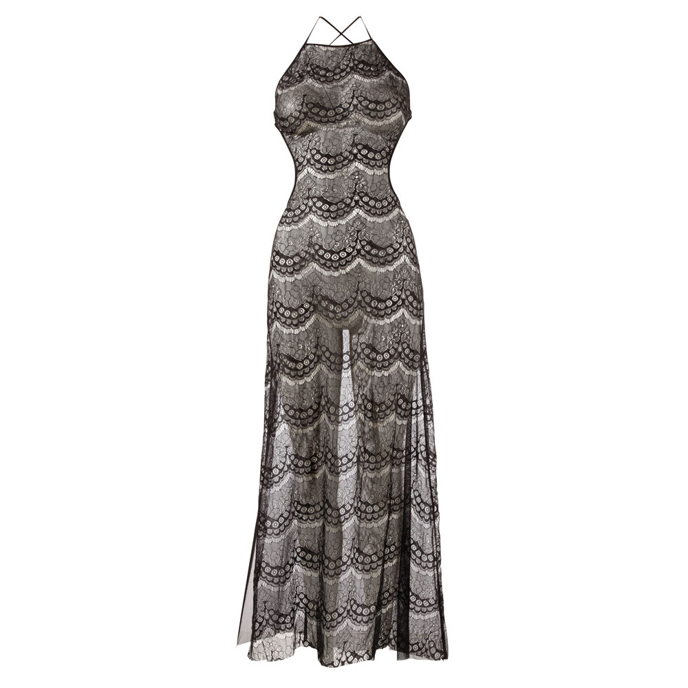 Mandy Mystery Backless Long Dress, a tastefull must have for any lingerie collection. Halterneck criss cross neck and back with open sides and split sides to finish off the lace detailed dress.