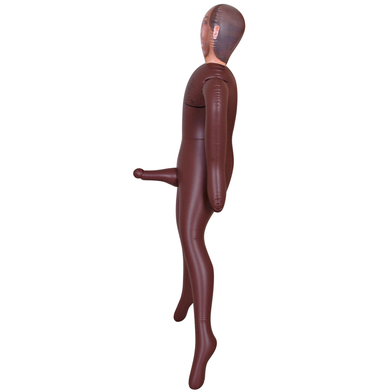 Black, male love doll with a firm penis, printed face, dark hair and printed chest hair. His mouth is closed, but he has a nice and tight anus. Inflatable to life-size.