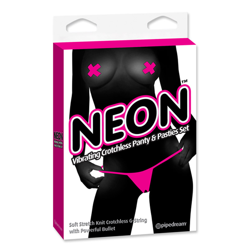 The neon vibrating crotchless panties don't just look great, these are the funniest panties you'll ever wear. Tucked away discreetly inside this soft stretch crotchless string is a hidden micro bullet designed to rock your world. The crotchless opening allows you to have sex with your panties on while the whisper quiet motor in the powerful micro bullet provides incredible stimulation. Try them in the shower or spa and turn bath time into pleasure time. Matching self adhesive x shaped pasties are made for teasing and perfect any time you want to look and feel sexy.