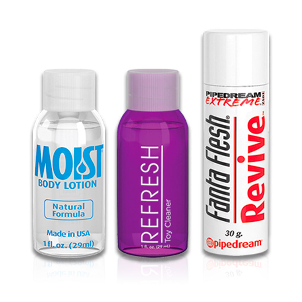 Why choose a favourite hole when you can have all three! This tantalizing trio of strokers is the perfect kit for the ultimate jack off sessions! The super-soft masturbators are made from velvety-smooth Fanta Flesh and wrap around every inch of your pleasure rod. Choose from a wide-open mouth, a spread-eagle pussy, or a virgin-tight ass, or enjoy all three! Slide inside each one of the strokers and you'll swear they feel just like the real thing...only better! Use plenty of Moist lotion for an extra wet, extra wild experience. Cleanup is a snap after the fun with toy cleaner and warm water.