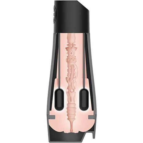 At the top of the stroker, you will find 4 easy to use buttons. Here you can increase or decrease the vibration settings, as well as toggle through each vibration pattern and shut the stroker off with a simple button push that is all within reach while stroking yourself to orgasm.