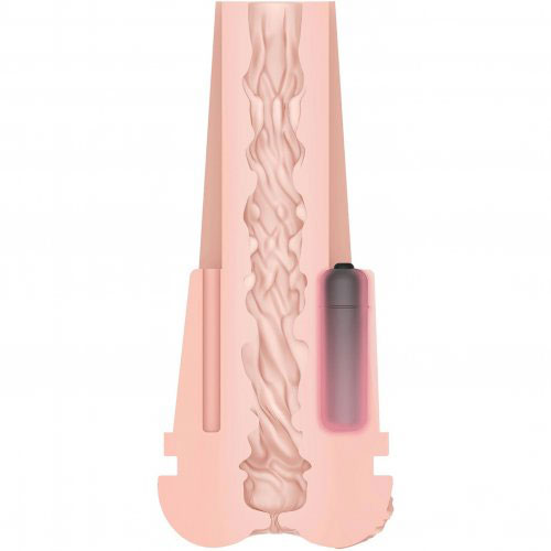 One of those welcome additions we were talking about above comes in the shape of a top cap that flips over to reveal the perfect holder for your smartphone or tablet. Just prop it up in front of you to watch a fave. Another improvement would be the vibration option. Skyla comes with a classic bullet vibe that slips snugly into a special slot on the side of the sleeve. You'll just need to slip the sleeve out of the case to insert/activate the bullet.
