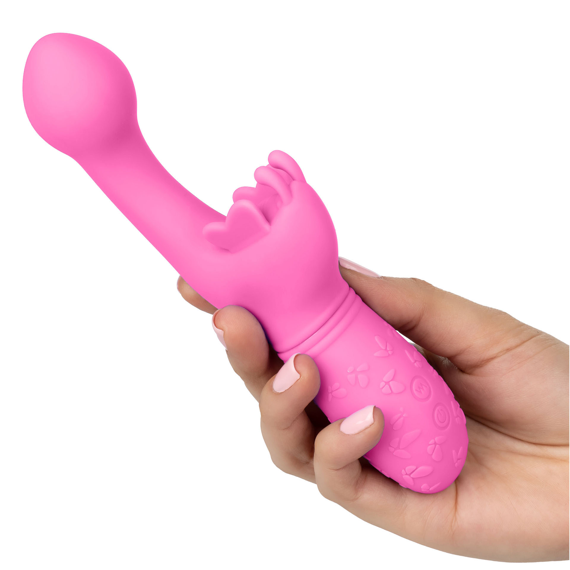 A blushing butterfly is a bold option for beginners and a sensual option for the erotically experienced. Cycle through 10 intense functions of vibration, pulsation and escalation with the single push-button control. Dual high-intensity motors put out knee-shaking vibration throughout every inch of this passionate vibrator. The fluttering wings and antennae of this flexible butterfly flicker faster with every increase of vibration to tickle external sweet spots and send you soaring toward orgasmic bliss. Explore up to 75 minutes on low speed or 50 minutes on high-speed vibrations with the single push-button. Recharge your pleasure in only 1 hour with the provided USB charging cable.