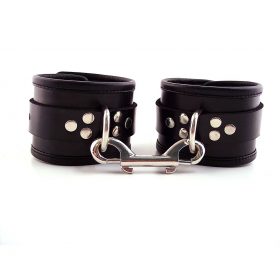 An exquisite pair of leather wrist cuffs. Fully adjustable buckle straps. Comes with a detachable double trigger hook chain connecting to a D Ring. Total length 11 inches