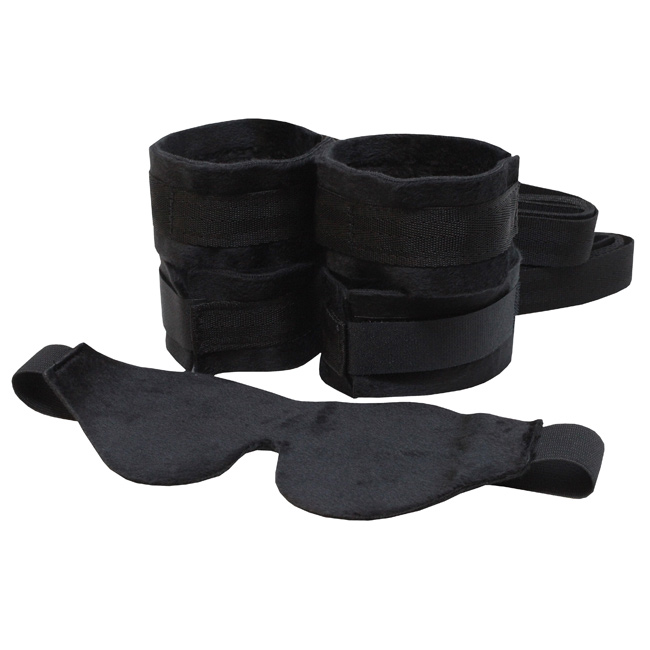 A hot and sexy beginner's kit for essential one-on-one bondage fun. This erotic kit includes, four wrist and ankle restrains with 44 inch long connector straps, and one soft black blindfold. Ideal for that first step into erotic bondage and restraining sex!